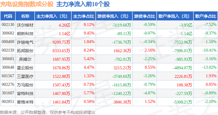资金流向方面,充电设施(980077)指数成份股当日主力资金净流出合计19.85亿元,游资资金净流入合计9.67亿元,散户资金净流入合计10.07亿元。成份股资金流向详情见下表: