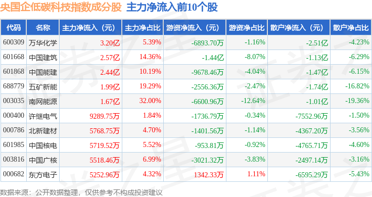 资金流向方面,央国企低碳科技(980082)指数成份股当日主力资金净流出合计18.55亿元,游资资金净流入合计1.5亿元,散户资金净流入合计17.05亿元。成份股资金流向详情见下表: