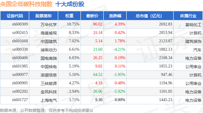 央国企低碳科技(980082)指数十大成份股详情如下: