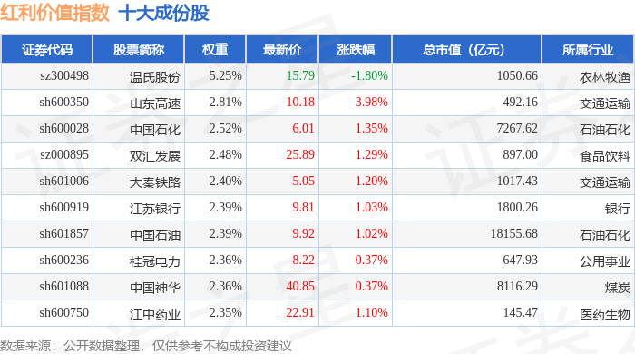 红利价值(980103)指数十大成份股详情如下: