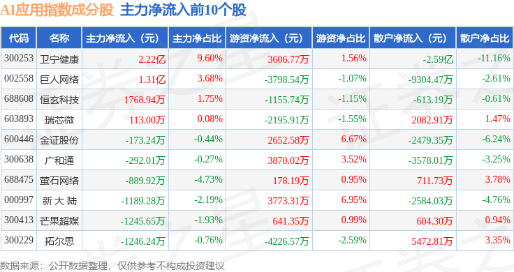 资金流向方面,AI应用(980112)指数成份股当日主力资金净流出合计36.37亿元,游资资金净流入合计15.15亿元,散户资金净流入合计21.22亿元。成份股资金流向详情见下表: