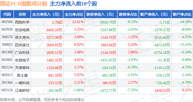 资金流向方面,国证PCB(980115)指数成份股当日主力资金净流出合计56.04亿元,游资资金净流入合计18.0亿元,散户资金净流入合计38.04亿元。成份股资金流向详情见下表: