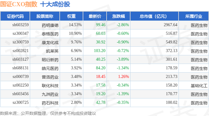 国证CXO(980120)指数十大成份股详情如下: