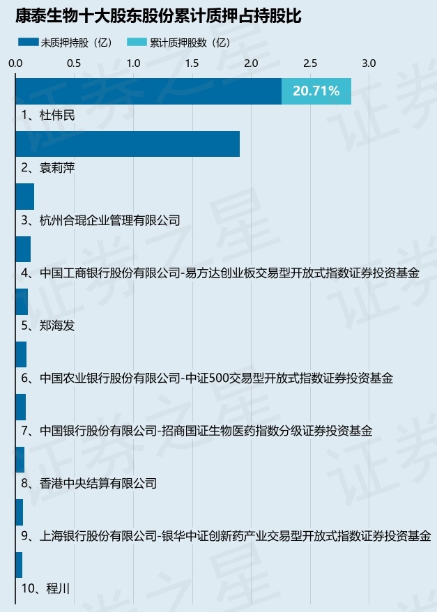 截止本公告日,股东杜伟民已累计质押股份5898.0万股,占其持股总数的20.71%。本次质押后康泰生物十大股东的累计质押股份占持股比例(占持股比例的计算以公司最新一期财务报表公布的十大股东的持股总数为基准)见下图: