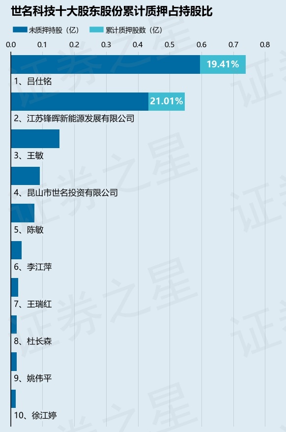截止本公告日,股东吕仕铭已累计质押股份1434.0万股,占其持股总数的19.41%,股东江苏锋晖新能源发展有限公司已累计质押股份1150.0万股,占其持股总数的21.01%。本次质押后世名科技十大股东的累计质押股份占持股比例(占持股比例的计算以公司最新一期财务报表公布的十大股东的持股总数为基准)见下图: