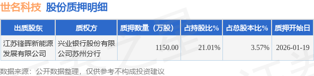 证券之星消息,世名科技(300522)1月20日公开信息显示,股东江苏锋晖新能源发展有限公司向兴业银行股份有限公司苏州分行合计质押1150.0万股,占总股本3.57%。质押详情见下表: