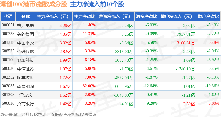 资金流向方面,湾创100(港币)(980002)指数成份股当日主力资金净流出合计104.39亿元,游资资金净流入合计10.19亿元,散户资金净流入合计94.2亿元。成份股资金流向详情见下表: