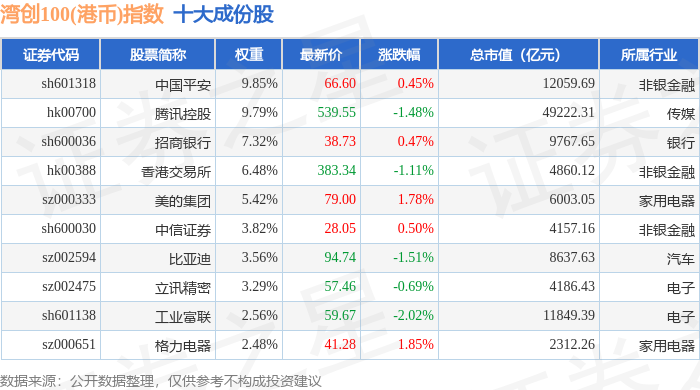 湾创100(港币)(980002)指数十大成份股详情如下: