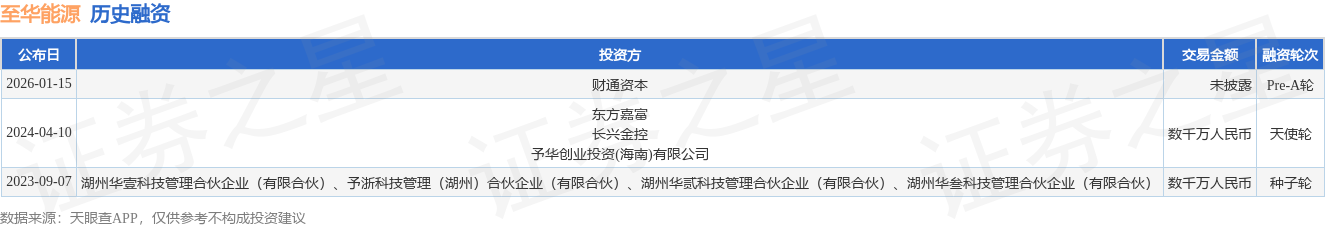 证券之星消息,根据天眼查APP于1月15日公布的信息整理,至华新能源科技(浙江)有限公司Pre-A轮融资,融资额未披露,参与投资的机构包括财通资本。