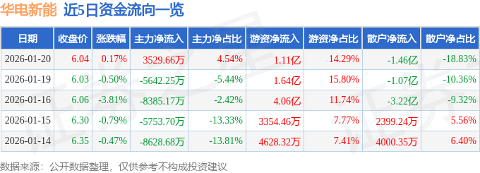 证券之星消息,截至2026年1月20日收盘,华电新能(600930)报收于6.04元,上涨0.17%,换手率4.0%,成交量129.15万手,成交额7.77亿元。