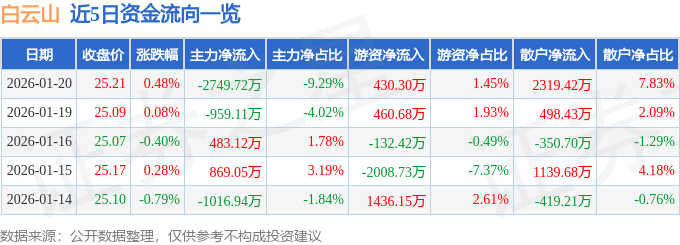 证券之星消息,截至2026年1月20日收盘,白云山(600332)报收于25.21元,上涨0.48%,换手率0.84%,成交量11.77万手,成交额2.96亿元。