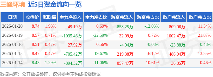 证券之星消息,截至2026年1月20日收盘,三峰环境(601827)报收于8.74元,上涨1.98%,换手率0.49%,成交量8.23万手,成交额7134.35万元。