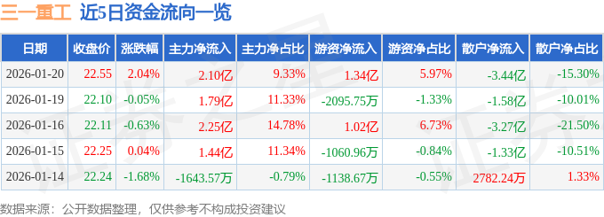 证券之星消息,截至2026年1月20日收盘,三一重工(600031)报收于22.55元,上涨2.04%,换手率1.19%,成交量100.45万手,成交额22.52亿元。