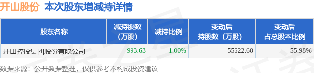 证券之星消息,1月20日开山股份发布公告《开山股份:关于控股股东、实际控制人及一致行动人权益变动触及1%整倍数的提示性公告》,其股东开山控股集团股份有限公司于2026年1月16日至2026年1月19日间合计减持993.63万股,占公司目前总股本的1.0%,变动期间该股股价上涨17.78%,截止1月19日收盘报18.61元。