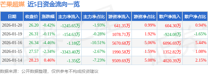 证券之星消息,截至2026年1月20日收盘,芒果超媒(300413)报收于26.2元,下跌0.42%,换手率2.42%,成交量24.68万手,成交额6.46亿元。