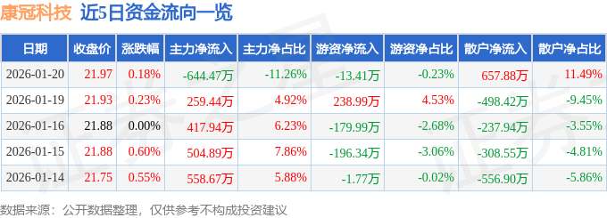 1月20日的资金流向数据方面,主力资金净流出644.47万元,占总成交额11.26%,游资资金净流出13.41万元,占总成交额0.23%,散户资金净流入657.88万元,占总成交额11.49%。