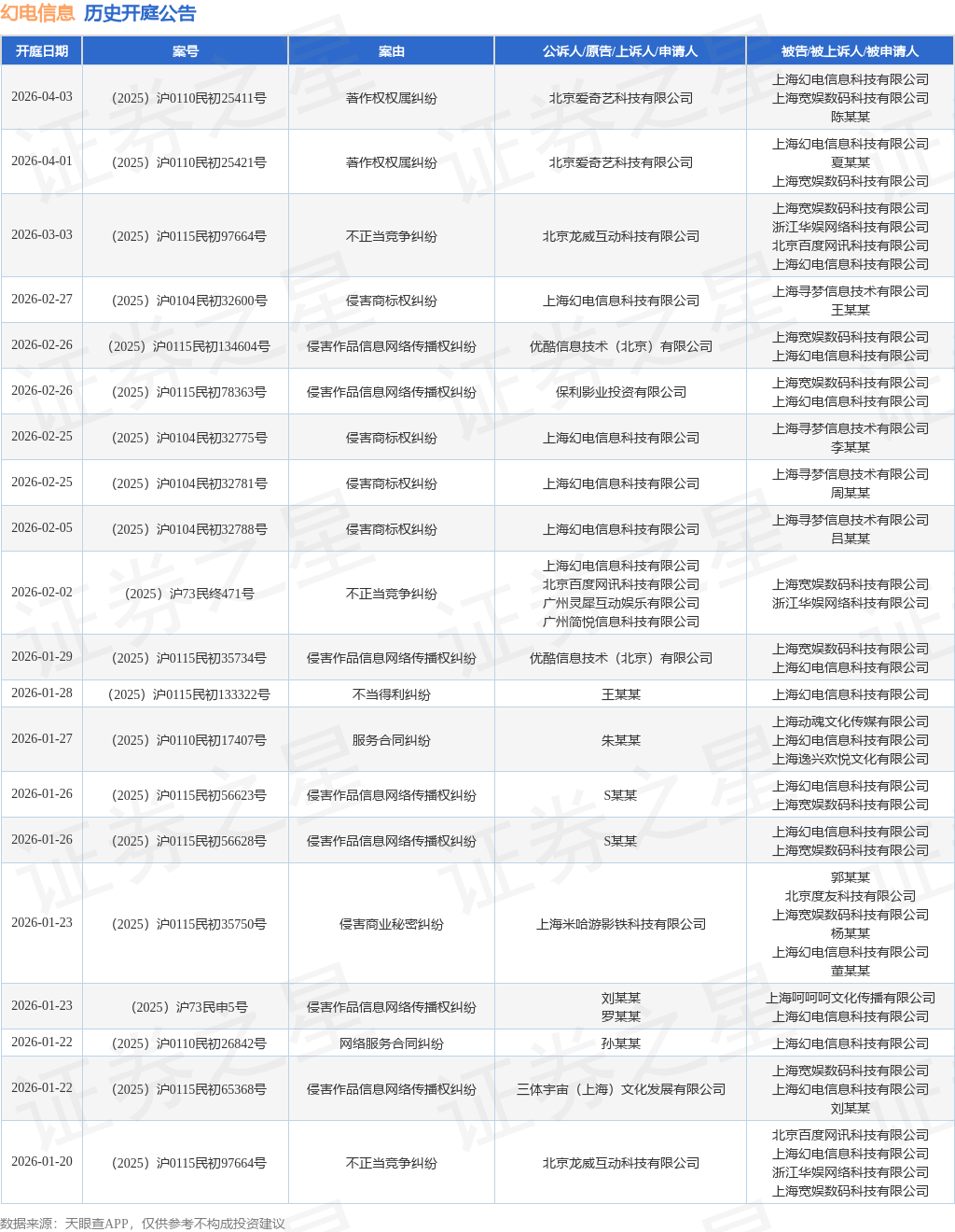 案号:(2025)沪0115民初35750号根据统计,近一年内以上海幻电信息科技有限公司为当事人的历史开庭公告有266则,其中案由为“侵害作品信息网络传播权纠纷”的公告以174则居首,其次为“不当得利纠纷”有27则,“网络服务合同纠纷”有10则。历史开庭公告(前20条)如下: