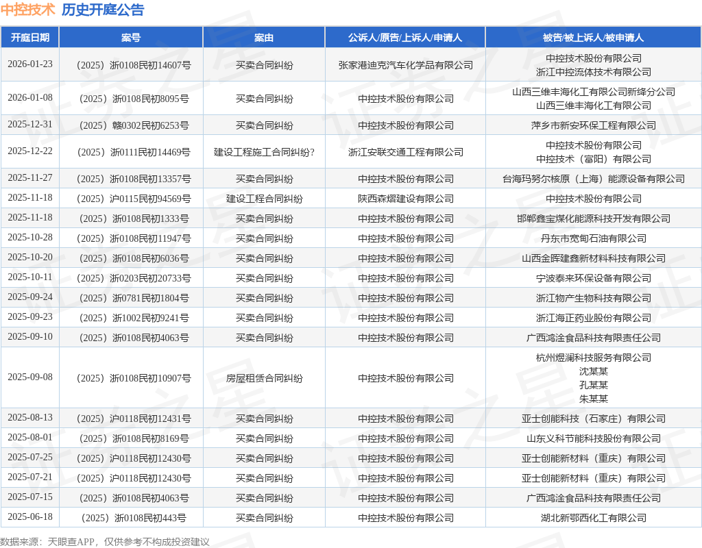 案号:(2025)浙0108民初14607号根据统计,近一年内以中控技术股份有限公司为当事人的历史开庭公告有40则,其中案由为“买卖合同纠纷”的公告以32则居首,其次为“承揽合同纠纷”有3则,“劳动争议”有1则。历史开庭公告(前20条)如下: