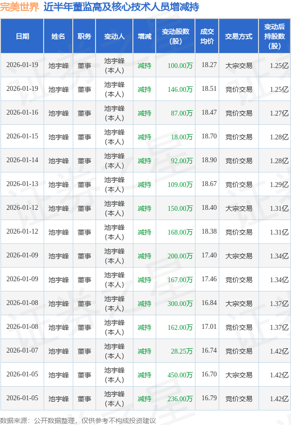 完美世界近半年内的董监高及核心技术人员增减持详情如下: