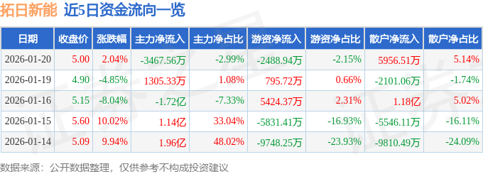 证券之星消息,截至2026年1月20日收盘,拓日新能(002218)报收于5.0元,上涨2.04%,换手率16.29%,成交量226.8万手,成交额11.59亿元。