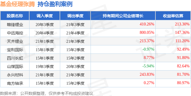 张腾管理的中邮核心优势灵活配置混合A基金在20年3季度买入赣锋锂业,在持有1年又0个季度后在21年3季度卖出。持有期间的估算收益率为213.3%,持有期间赣锋锂业在2020年到2021年的年报归属净利润增幅达410.26%。