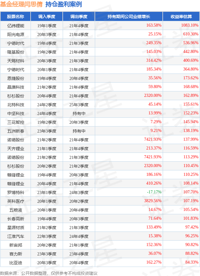 闫思倩管理的工银新能源汽车混合A基金在19年1季度买入亿纬锂能,在持有2年又3个季度后在21年4季度卖出。持有期间的估算收益率为1083.1%,持有期间亿纬锂能在2019年到2021年的年报营业总收入增幅达163.58%。
