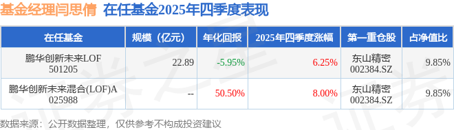 证券之星消息,截止2025年四季度末,基金经理闫思倩旗下共管理2只基金,本季度表现最佳的为鹏华创新未来混合(LOF)A(025988),季度净值涨8.0%。