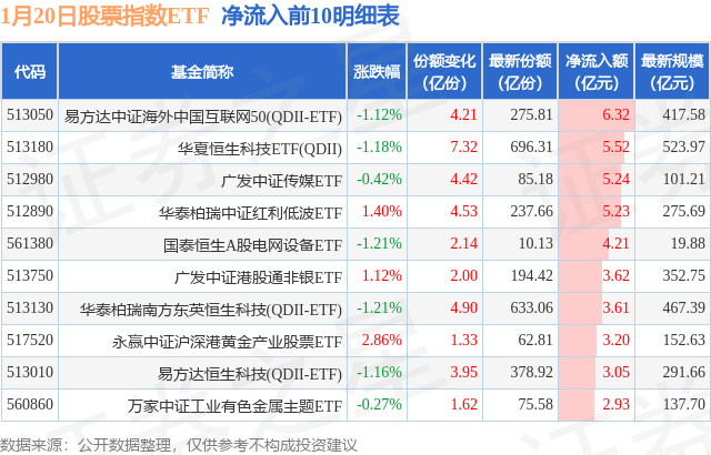 当日有237只股票指数ETF基金出现资金净流入,其中净流入排首位的是易方达中证海外中国互联网50(QDII-ETF)(513050),份额增加了4.21亿份,净流入额为6.32亿元。