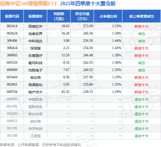 招商中证500增强策略ETF基金成立于2023年3月29日,基金经理为邓童,基金跟踪标的为中证500指数,成立以来超额回报为17.7%,近一个月超额回报为-3.82%。最新披露的基金持仓数据显示,截止2025年12月31日,该基金第一大重仓股为高德红外(002414),持股占比为1.53%。
