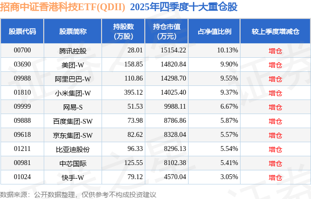 招商中证香港科技ETF(QDII)基金成立于2022年1月26日,基金经理为刘重杰,基金跟踪标的为中证香港科技指数指数,成立以来超额回报为-59.17%,近一个月超额回报为-0.53%。最新披露的基金持仓数据显示,截止2025年12月31日,该基金第一大重仓股为腾讯控股(00700),持股占比为10.13%。