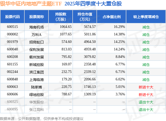 银华中证内地地产主题ETF基金成立于2022年1月27日,基金经理为张亦驰,基金跟踪标的为中证内地地产主题指数,成立以来超额回报为4.16%,近一个月超额回报为-0.04%。最新披露的基金持仓数据显示,截止2025年12月31日,该基金第一大重仓股为海南机场(600515),持股占比为16.29%。