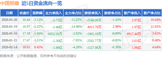 证券之星消息,截至2026年1月20日收盘,中国核建(601611)报收于16.44元,下跌3.12%,换手率3.61%,成交量108.81万手,成交额17.86亿元。