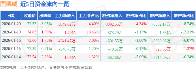 证券之星消息,截至2026年1月20日收盘,固德威(688390)报收于72.55元,下跌3.05%,换手率3.9%,成交量9.47万手,成交额6.93亿元。
