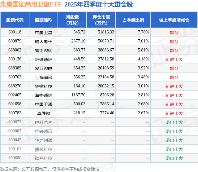 永赢国证商用卫星ETF基金成立于2025年3月6日,基金经理为刘庭宇,基金跟踪标的为国证商用卫星通信产业指数,成立以来超额回报为-3.85%,近一个月超额回报为-0.02%。最新披露的基金持仓数据显示,截止2025年12月31日,该基金第一大重仓股为中国卫星(600118),持股占比为7.78%。