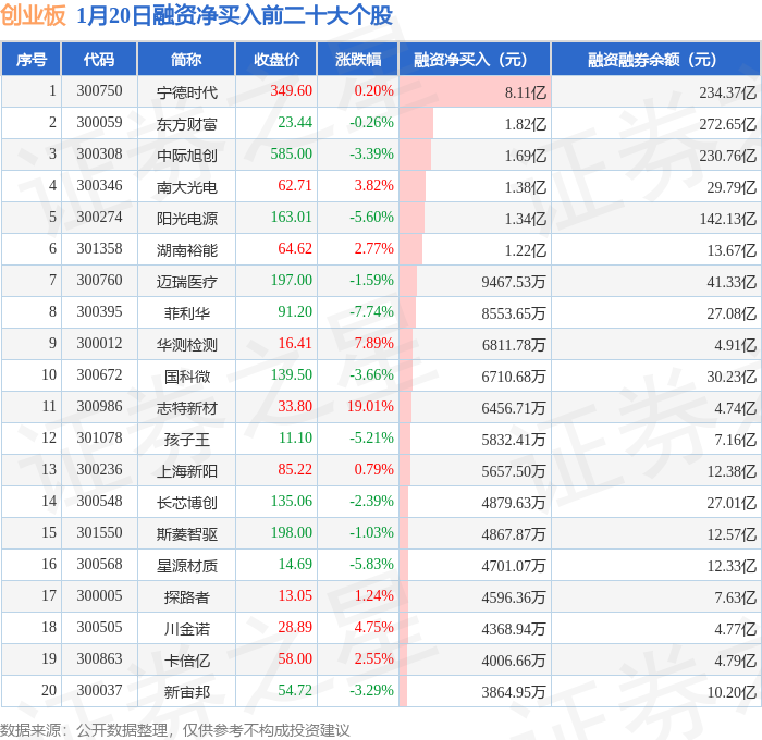 创业板融资净买入前三分别为:宁德时代(300750)融资净买入8.11亿元、东方财富(300059)融资净买入1.82亿元、中际旭创(300308)融资净买入1.69亿元,前20具体见下表: