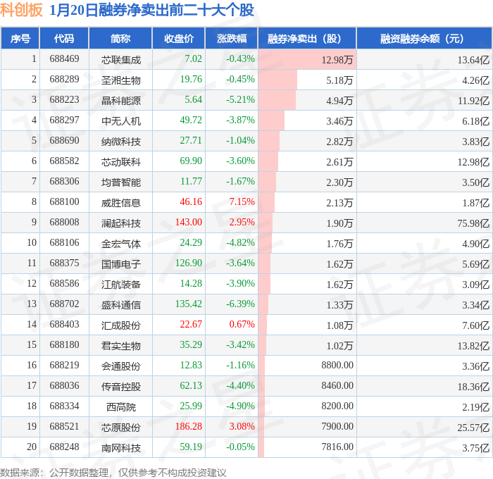 科创板融券净卖出前三分别为:芯联集成(688469)融券净卖出12.98万股、圣湘生物(688289)融券净卖出5.18万股、晶科能源(688223)融券净卖出4.94万股,前20具体见下表: