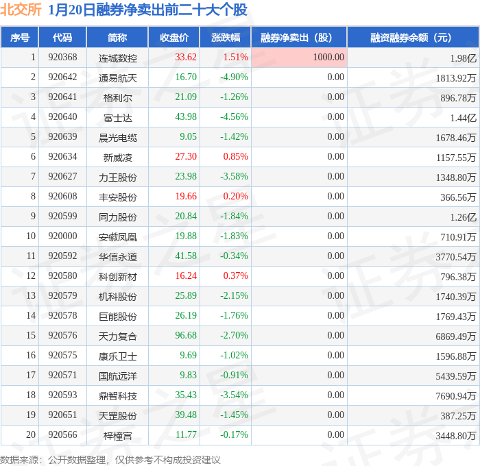 北交所融券净卖出前三分别为:连城数控(920368)融券净卖出1000股,前20具体见下表: