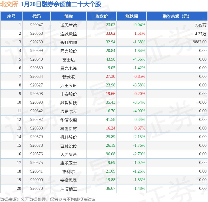北交所融券余额前三分别为:诺思兰德(920047)融券余额7.49万元、连城数控(920368)融券余额4.37万元、长虹能源(920239)融券余额9882元,前20具体见下表:
