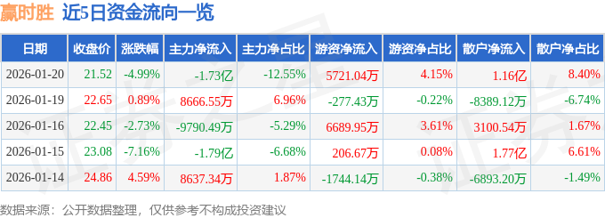 证券之星消息,截至2026年1月20日收盘,赢时胜(300377)报收于21.52元,下跌4.99%,换手率9.18%,成交量63.42万手,成交额13.79亿元。