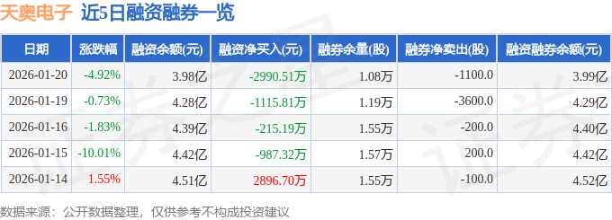 天奥电子融资融券信息显示,融资方面,当日融资买入5093.14万元,融资偿还8083.64万元,融资净偿还2990.51万元。融券方面,融券卖出1100.0股,融券偿还2200.0股,融券余量1.08万股,融券余额23.58万元。融资融券余额3.99亿元。
