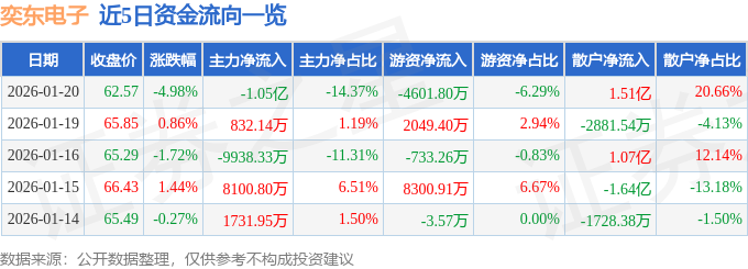 1月20日的资金流向数据方面,主力资金净流出1.05亿元,占总成交额14.37%,游资资金净流出4601.8万元,占总成交额6.29%,散户资金净流入1.51亿元,占总成交额20.66%。