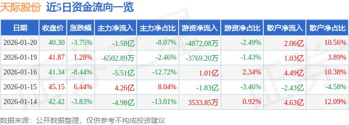 证券之星消息,截至2026年1月20日收盘,天际股份(002759)报收于40.3元,下跌3.75%,换手率9.51%,成交量47.64万手,成交额19.54亿元。