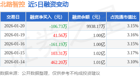 证券之星消息,1月20日,北路智控(301195)融资买入523.15万元,融资偿还629.88万元,融资净卖出106.73万元,融资余额9938.17万元,近20个交易日中有11个交易日出现融资净买入。