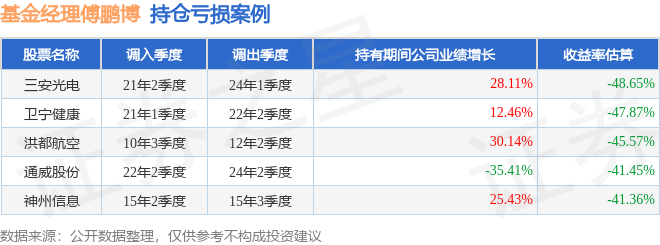 傅鹏博管理的睿远成长价值混合A基金在21年2季度买入三安光电,在持有2年又3个季度后在24年1季度卖出。持有期间的估算收益率为-48.65%,持有期间三安光电在2021年到2024年的年报营业总收入增幅达28.11%。