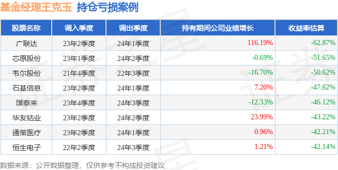 王克玉管理的泓德致远混合A基金在23年2季度买入广联达,在持有3个季度后在24年1季度卖出。持有期间的估算收益率为-62.87%,持有期间广联达在2023年到2024年的年报归属净利润增幅达116.19%。