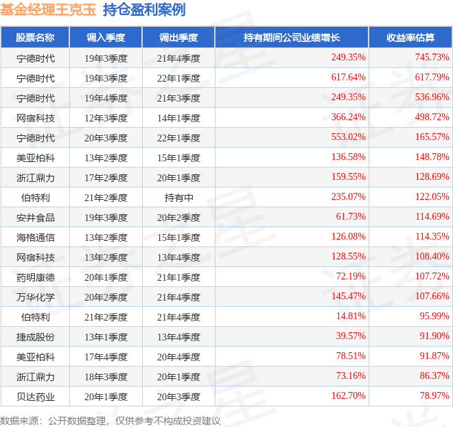 王克玉管理的泓德优选成长混合基金在19年3季度买入宁德时代,在持有2年又1个季度后在21年4季度卖出。持有期间的估算收益率为745.73%,持有期间宁德时代在2019年到2021年的年报归属净利润增幅达249.35%。