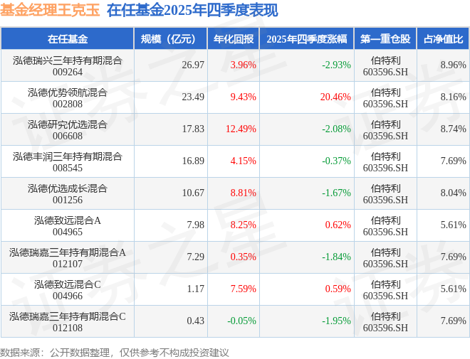 王克玉管理的泓德优势领航混合基金在21年2季度买入伯特利,在持有2个季度后在21年4季度卖出。持有期间的估算收益率为95.99%,持有期间伯特利在2020年到2021年的年报营业总收入增幅达14.81%。