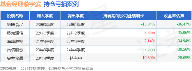 蔡宇滨管理的招商安益灵活配置混合A基金在23年3季度买入绝味食品,在持有2个季度后在24年1季度卖出。持有期间的估算收益率为-36.47%,持有期间绝味食品在2023年到2024年的年报营业总收入降幅为13.84%。
