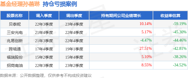 孙蓓琳管理的银华聚利灵活配置混合A基金在22年3季度买入贝泰妮,在持有1年又1个季度后在23年4季度卖出。持有期间的估算收益率为-59.19%,持有期间贝泰妮在2022年到2023年的年报营业总收入增幅达10.14%。