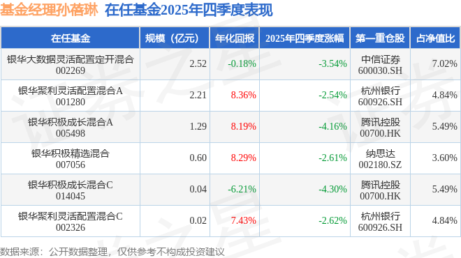 证券之星消息,截止2025年四季度末,基金经理孙蓓琳旗下共管理6只基金,本季度表现最佳的为银华聚利灵活配置混合A(001280),季度净值跌2.54%。